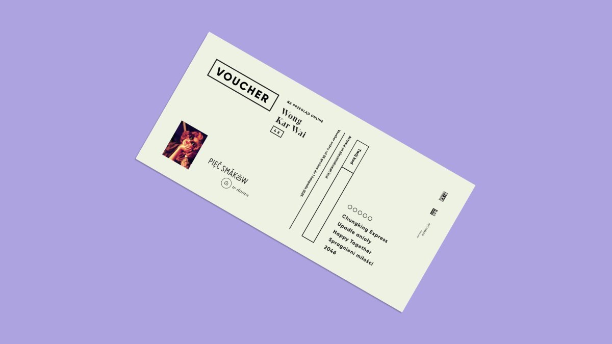 - Voucher na przegląd online Wong Kar Wai 4k pozwala na obejrzenie 5 filmów Wong Kar Waia, do 1 czerwca 2026.
